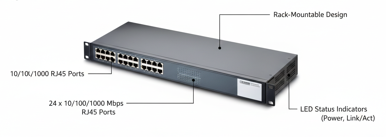 Ethernet switch, 24 Ethernet ports on the front in RJ45 format, automatic detection of 10 or 100 Mbps data transmission rate, coupling of network segments with different transmission speeds, auto crossing function, installs in 19-in. (482 mm) rack