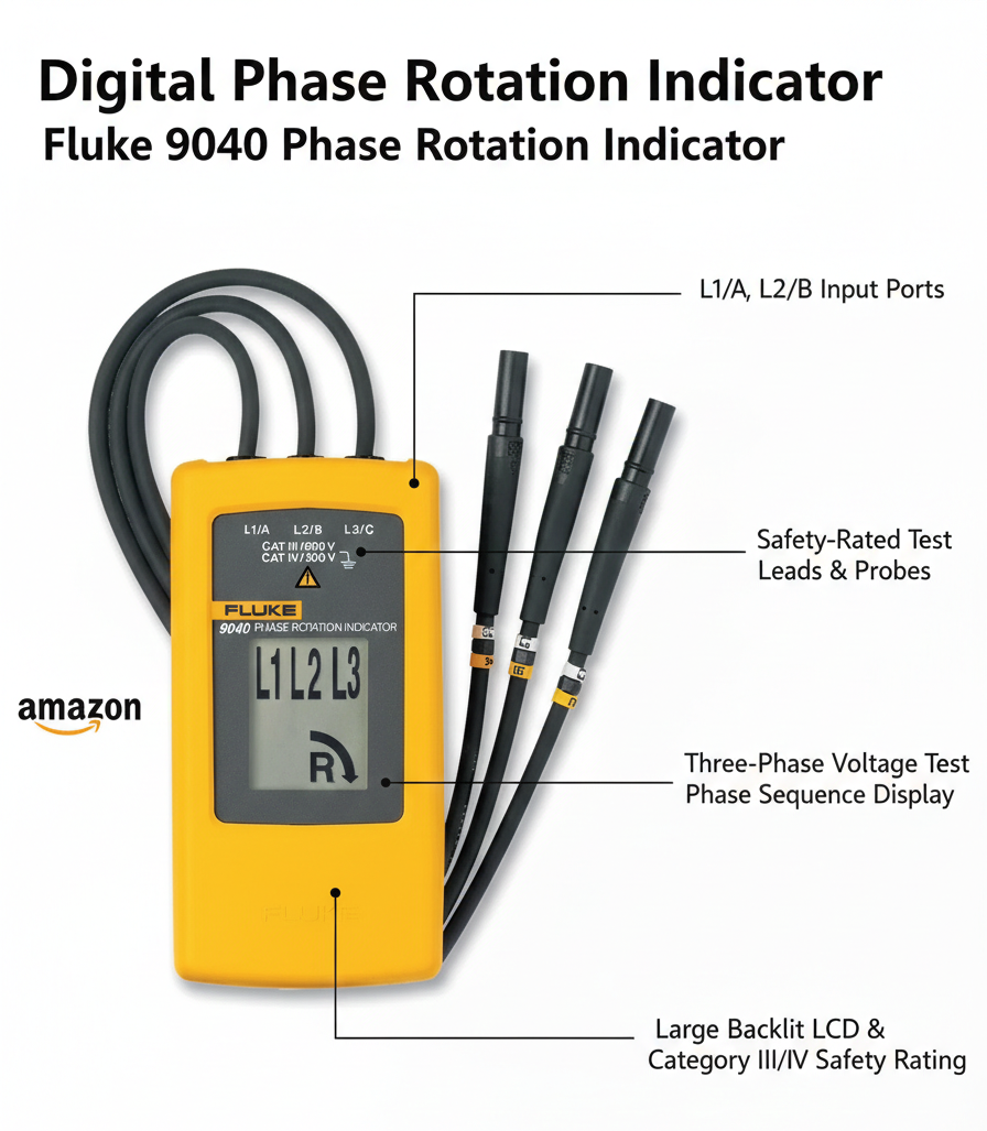 The Fluke 9040 is effective for measuring phase rotation in all areas where three phase supplies are used to feed motors, drives and electrical systems. The Fluke 9040 is a rotary field indicator and can provide clear indication of the 3 phase via an LCD display and the phase rotation direction to determine correct connections. It allows rapid determination of phase sequence and has a voltage (up to 700 V) and frequency range suitable for commercial and industrial applications. The included test probes have a variable clamping range for safe contact, also in industrial sockets.