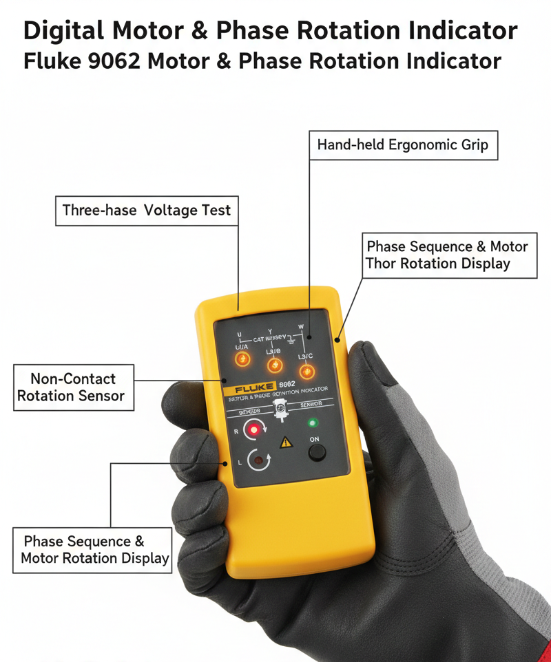 The unique Fluke 9062 provides rotary field and motor rotation indication with the benefits of contact-less detection. Purpose made for commercial and industrial environments, the Fluke 9062 provides rapid indication of 3 phase rotation using test leads supplied or can be used to determine motor rotation on synchronous and asynchronous 3 phase motors. The contact-less detection is ideal for use on motors where the shaft is not visible. The included test probes have a variable clamping range for safe contact, also in industrial sockets.