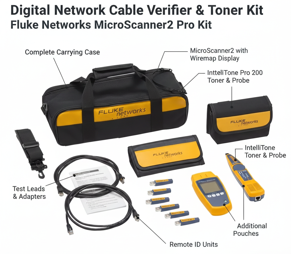 Includes IntelliTone Pro 200 Probe, Remote ID kit, Duffle Bag, Multi-Connector Adapter, Cat6A patch cord, RJ45 male to RJ45 female patch cord , RJ45/M12X patch cord, RJ45/M12D patch cord, RJ45/M8D patch cord for testing of M12X, M12D, M8D terminated cables.